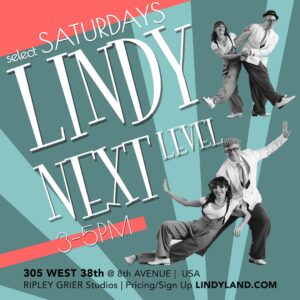 LINDY NEXT LEVEL | DIPS & TRICKS | Special Addition 2HR LEVEL 2 and up LOCATION: RIPLEY GRIER 305 WEST 38th Street (at corner of EIGHTH AVE) Add stylish Lindy Hop partner combinations and patterns to expand your swing dance knowledge with an emphasis on DIPS & TRICKS. The Techniques of counter-balance, grounding and responsibilities of leader and follow are studied for optimal execution of the material. We will break at half way mark for a refresh. REGISTRATION OPEN NOW.…